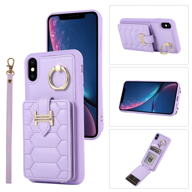 Funda para teléfono iPhone Xs Vertical Card Bag Ring Holder con doble cordón (Púrpura)