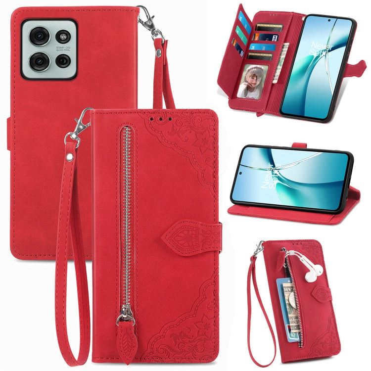 Funda de Cuero con Cremallera y Flores en Relieve para Motorola Moto G75 5G (Rojo)