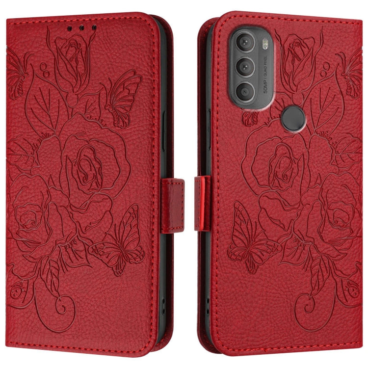 Funda de Cuero Antirrobo RFID con Relieve para Motorola Moto G54 5G (Rojo)