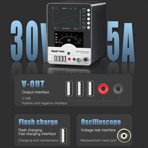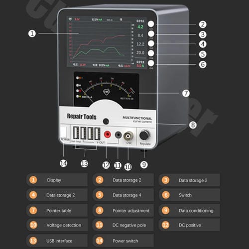 • Potencia de salida de 150W, salida de alta frecuencia ajustable, múltiples modos de medición (0-5A / 0-50mA / 0-500mA), Almacenamiento de datos en cuatro grupos ajustables, visualización hiperbólica de corriente y voltaje
