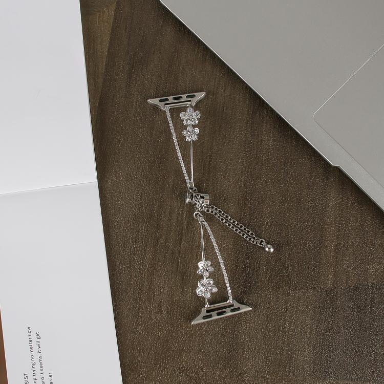 Correa de reloj con flor de cinco pétalos y circonitas incrustadas de cobre para Apple Watch de 42 mm, 41 mm, 40 mm y 38 mm (plateada)