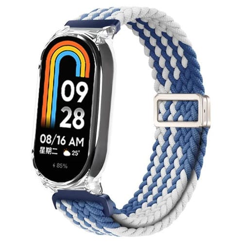 Correa de reloj elástica trenzada de nailon con hebilla magnética y marco de PC transparente para Xiaomi Mi Band 6/5/4/3 (azul y blanco)