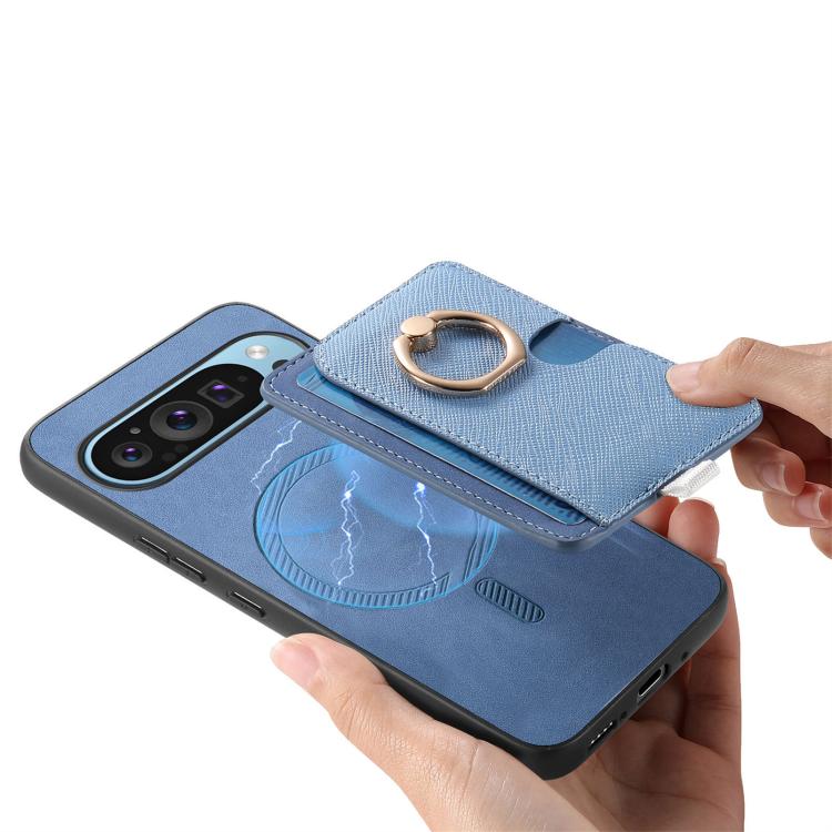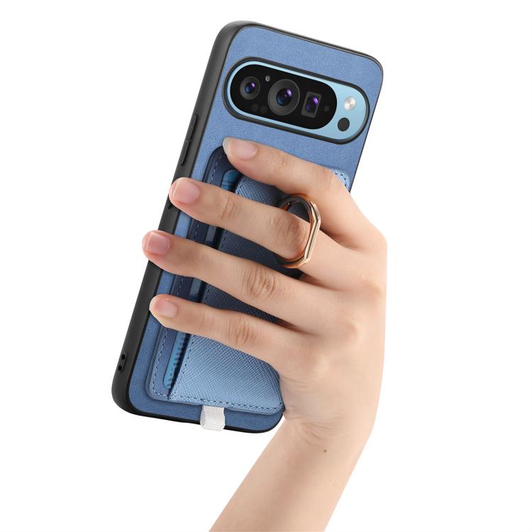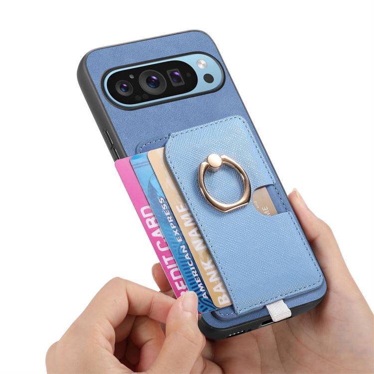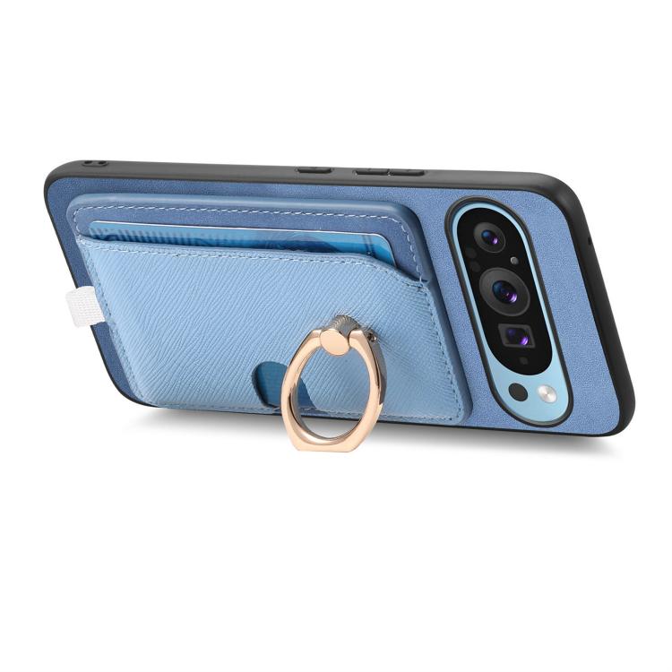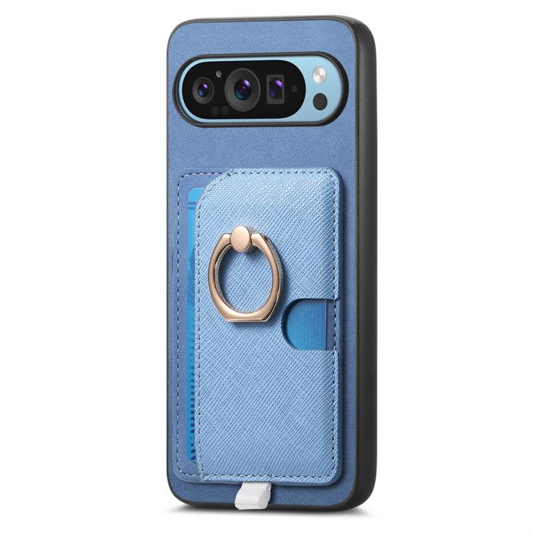 Estuche para Google Pixel 8A con Ranuras para Tarjetas, Diseño Retro de Cruz, Cuero y Anillo Lateral (Azul)