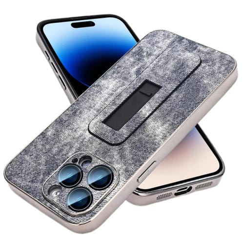 Étui de téléphone à support de poussée et de traction galvanisé à motif denim pour iPhone 14 Pro Max (gris bleu)