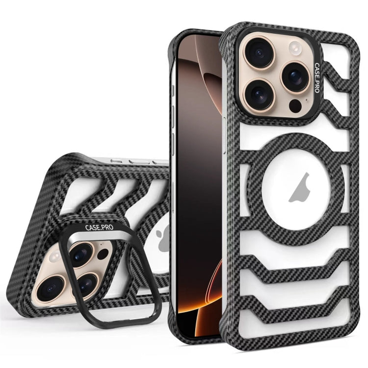 Estuche para Teléfono Magsafe con Soporte y Protección de Lente Fibra de Carbono para iPhone 16 Pro Max (Negro)