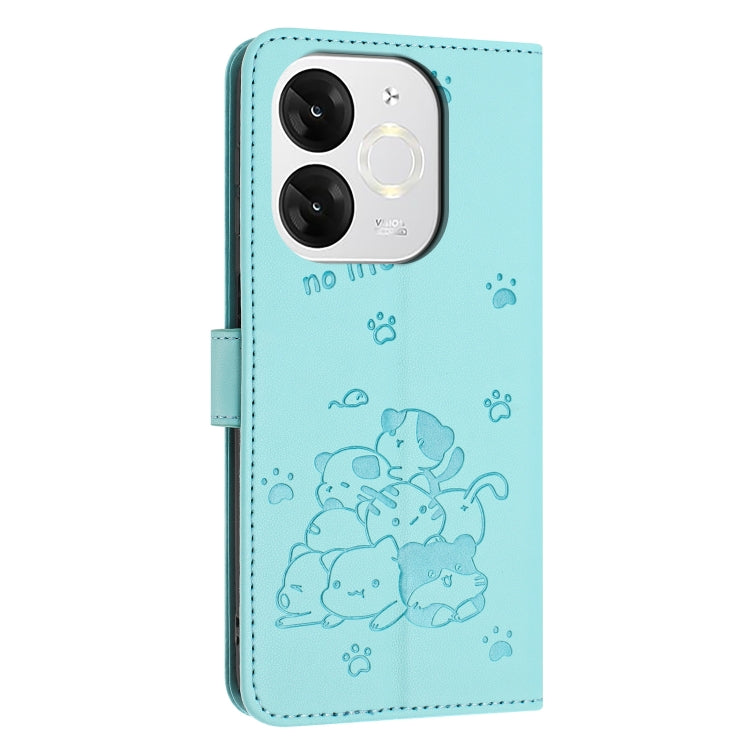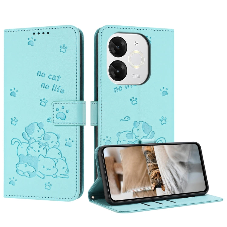 Funda de Cuero con Cordón para Teléfono Itel A80 con Gatito en Relieve (Verde Menta)