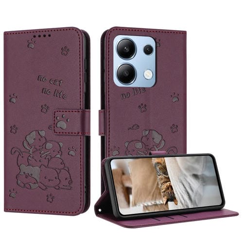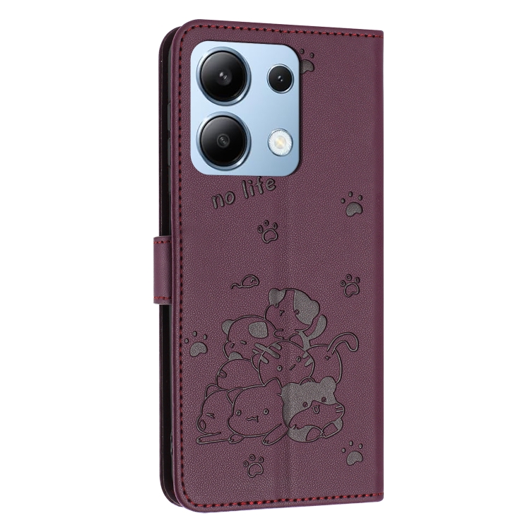 Funda de Cuero con Estampado de Gatito y Cordón para Redmi Note 13 4G (Rojo Vino)