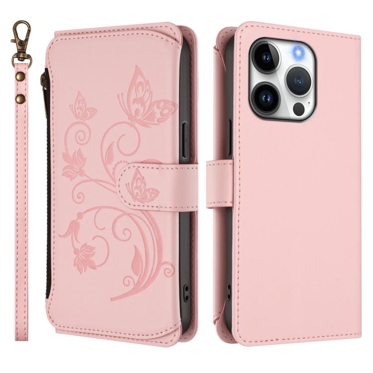 Funda de cuero con cremallera para iPhone 16 Pro, diseño de mariposas, flores y amor (rosa)
