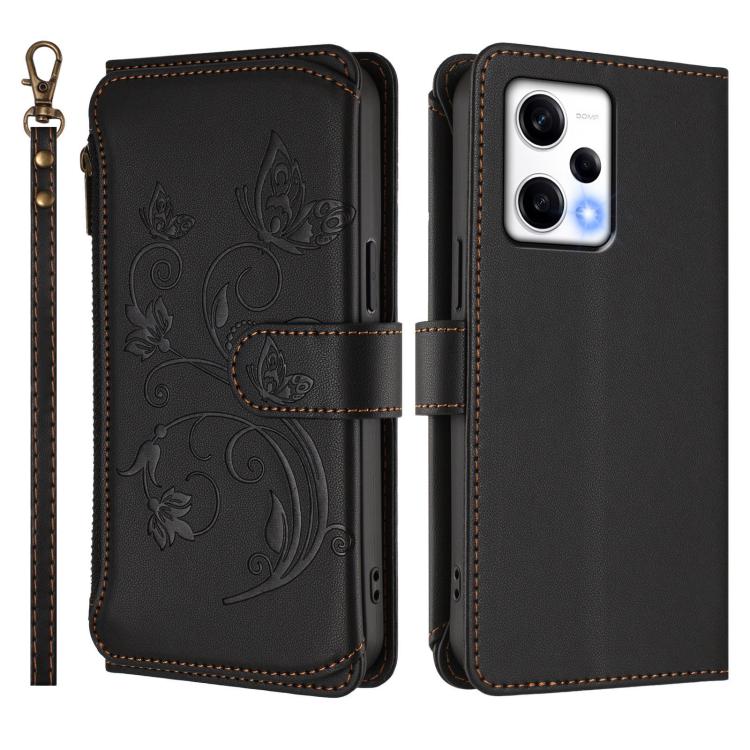 Funda de cuero con cremallera para Redmi Note 12 Pro+ Global / Note 12 Explorer, diseño de mariposas, flores y amor, con múltiples tarjetas (negro)