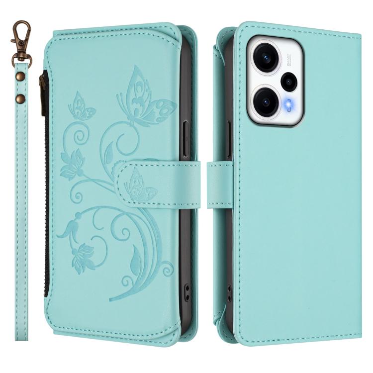 Funda de cuero con cremallera para Redmi Note 12 Turbo / Xiaomi Poco F5, diseño de mariposas y flores (verde menta)