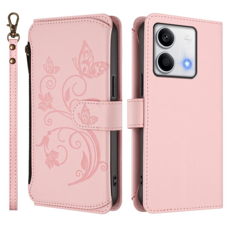 Funda de cuero con cremallera para Redmi Note 13 5G, diseño de mariposas, flores y mariposas (rosa)