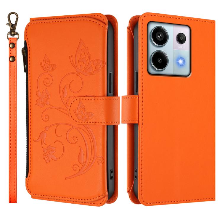 Funda de cuero con cremallera para Redmi Note 13 Pro 5G / Xiaomi Poco X6, diseño de mariposas, flores y mariposas (naranja)