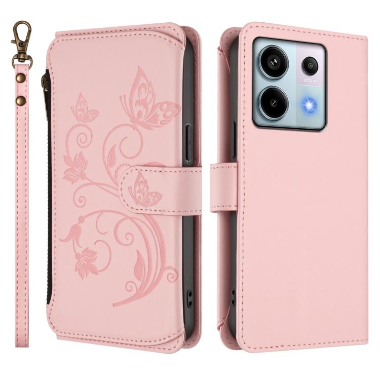 Funda de cuero con cremallera para Redmi Note 13 Pro 5G / Xiaomi Poco X6, diseño de mariposas, flores y mariposas (rosa)