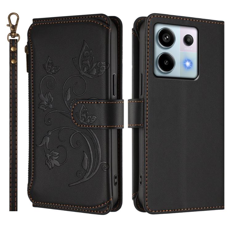 Funda de cuero con cremallera para Redmi Note 13 Pro 5G / Xiaomi Poco X6, diseño de mariposas y flores, con múltiples tarjetas (negro)