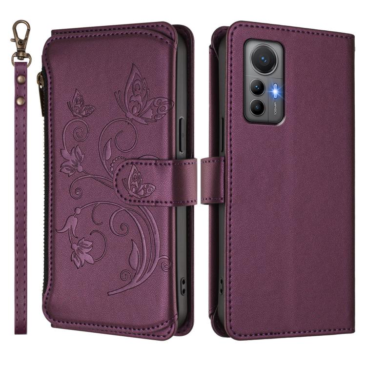 Funda de cuero con cremallera para Xiaomi 12 Lite, diseño de mariposas, flores y mariposas (morado oscuro)