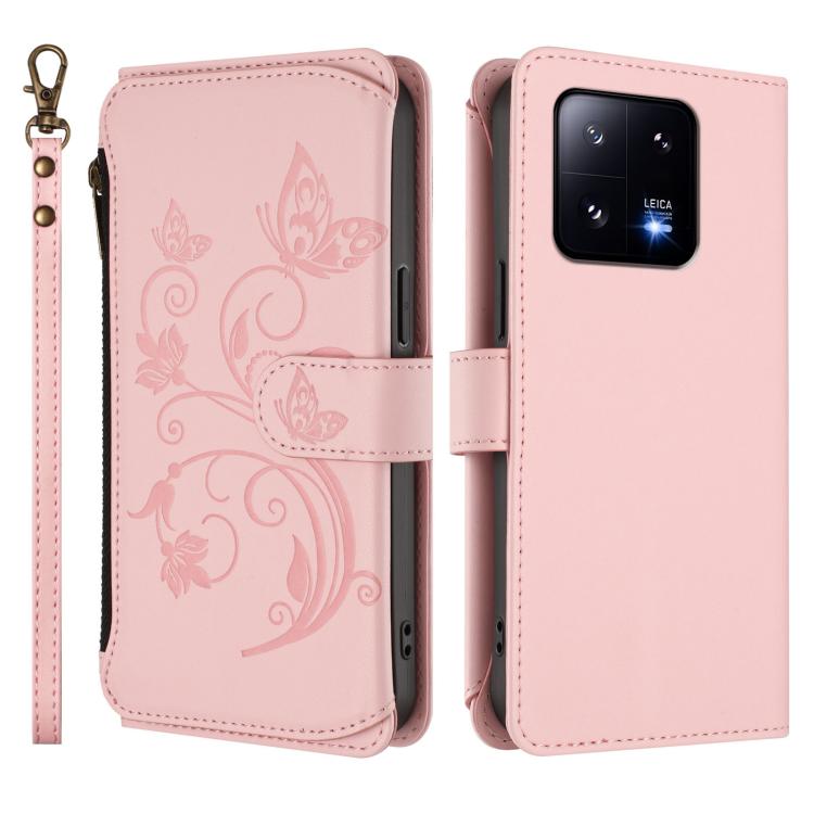 Funda de cuero con cremallera para Xiaomi 13 Pro, diseño de mariposas, flores y mariposas (rosa)