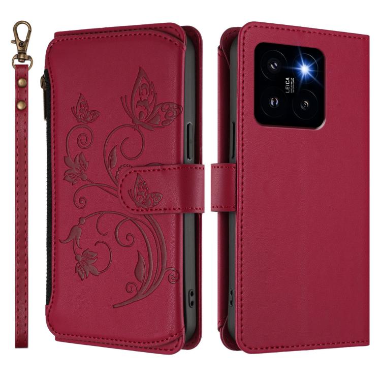 Funda de cuero con cremallera para Xiaomi 14 Pro, diseño de mariposas, flores y mariposas (rojo vino)