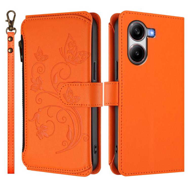 Funda de cuero con cremallera para Xiaomi Poco X7 Pro, diseño de mariposas, flores y mariposas (naranja)