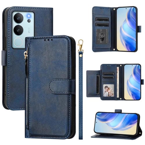 Funda de Cuero con Cremallera y Ranuras para Múltiples Tarjetas para Vivo V29E 5G / Y200 5G (Azul)