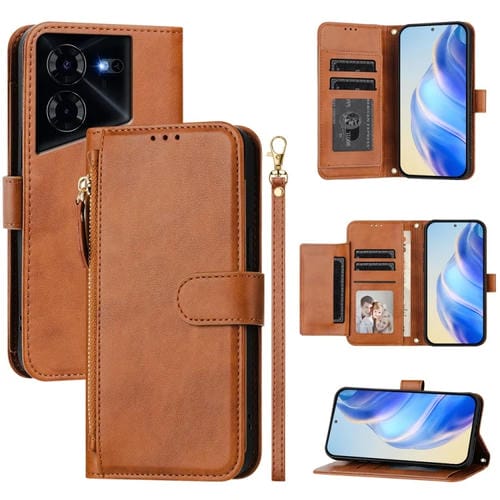 Funda de Cuero para Tecno Pova 5 Pro con Cremallera y Ranuras para Tarjetas (Marrón)