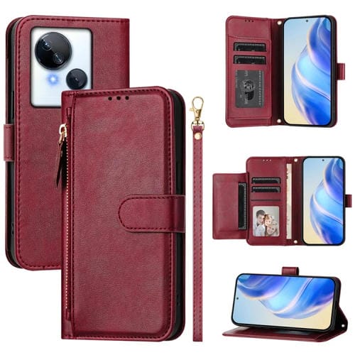 Funda de Cuero con Cremallera para Tecno Spark 10 5G con Ranuras para Tarjetas (Rojo Oscuro)