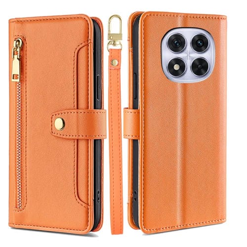 Funda de Cuero con Textura de Oveja para Redmi Note 14 Pro 5G, Tipo Cartera, con Cremallera y Bandolera (Naranja)
