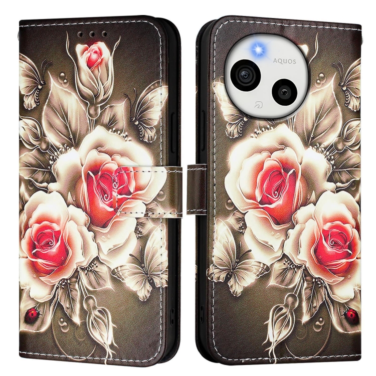 Funda de Cuero para Sharp Aquos Sense9 con Diseño de Dibujos (Rosas Sobre Negro)