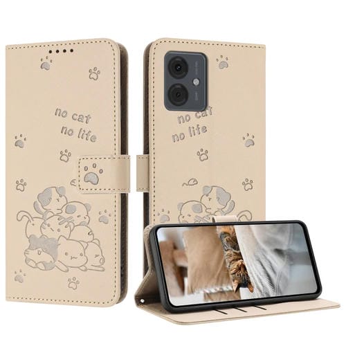 Funda de Cuero Motorola Moto G04/G24/G04S con Diseño de Gatito En Relieve y Cordón (Beige)