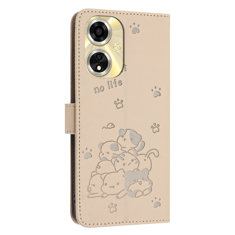 Funda de Piel con Diseño de Gatito En Relieve para Oppo A59 5G con Cordón (Beige)