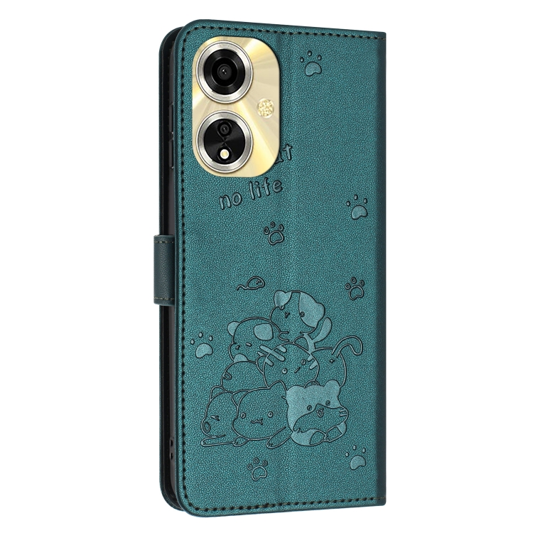 Funda de Cuero con Estampado de Gatito y Cordón para Oppo A59 5G (Verde Oscuro)