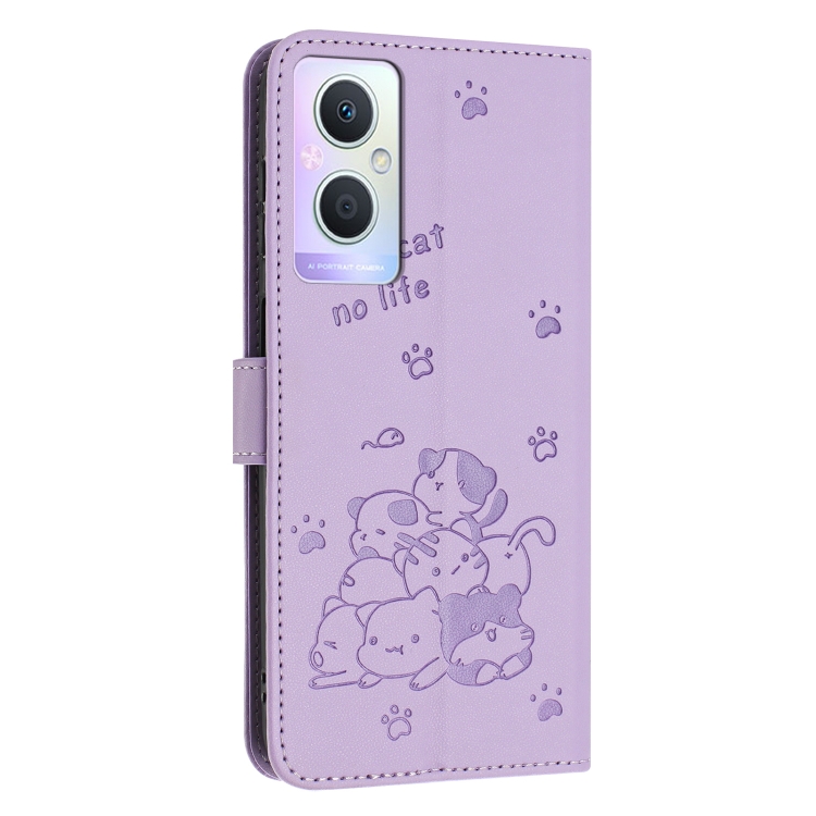 Funda de Cuero con Diseño de Gatito En Relieve para Oppo Reno7 Z Global con Cordón (Morado)