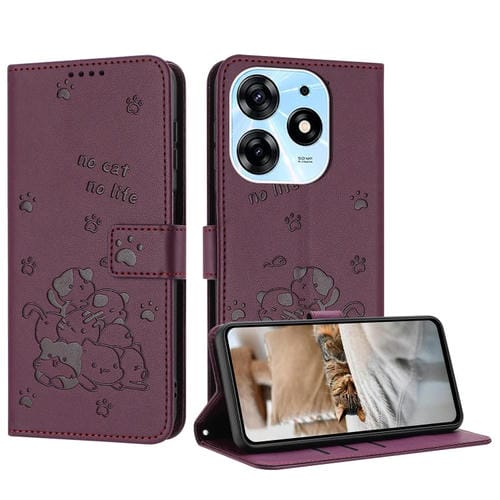Funda de Cuero para Tecno Spark 10 Pro K17 4G con Diseño de Gatito y Cordón (Rojo Vino)