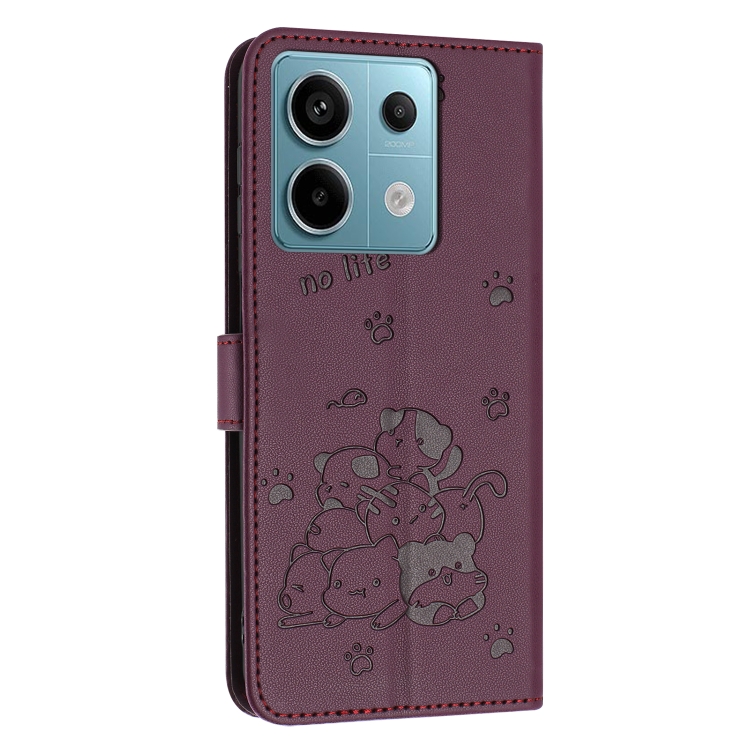Funda de Piel con Diseño de Gatito En Relieve y Cordón para Xiaomi Poco X6 5G (Rojo Vino)