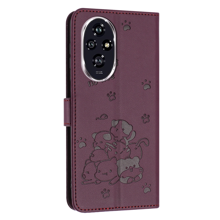 Funda de Piel para Honor 200 5G con Diseño de Gatito en Relieve y Cordón (Rojo Vino)