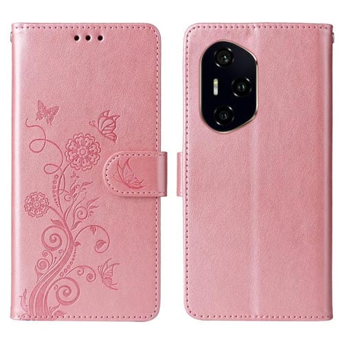 Funda de Cuero para Honor 300 Pro con Diseño de Mariposas y Flores en Relieve (Oro Rosa)