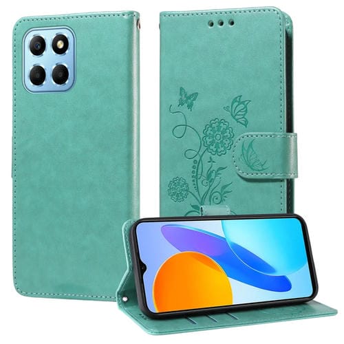 Funda de Cuero para Honor X8 5G/X6 4G/X8A 5G con Diseño de Mariposas y Flores en Relieve (Verde)