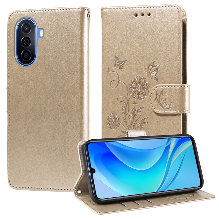 Funda de Cuero Huawei Nova Y70 Plus con Diseño de Mariposas y Flores en Relieve (Dorada)