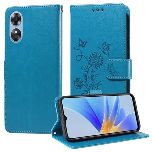 Funda de Cuero con Diseño de Mariposas y Flores En Relieve para Oppo A17 4G Global/A17K Global (Azul)
