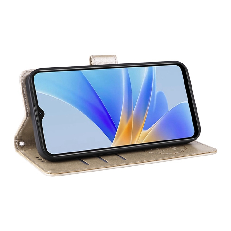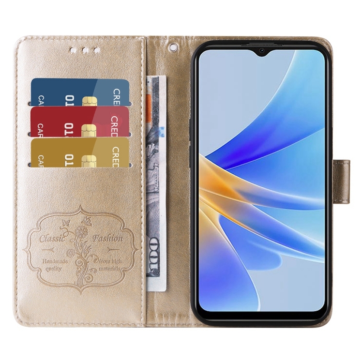 Funda de Cuero con Diseño de Mariposas y Flores En Relieve para Oppo A17 4G Global/A17K Global (Dorada)