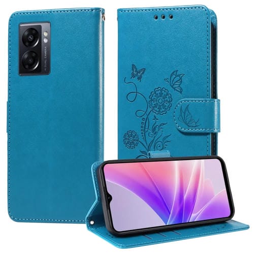 Funda de Cuero con Diseño de Mariposas y Flores En Relieve para Oppo A77 4G/5G/A77S 4G (Azul)