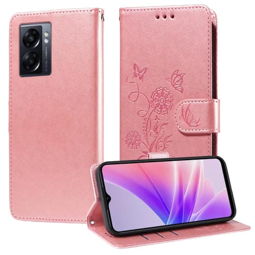 Funda de Cuero con Diseño de Mariposas y Flores En Relieve para Oppo A77 4G/5G/A77S 4G (Oro Rosa)
