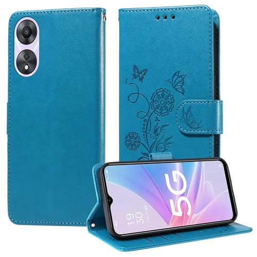 Funda de Cuero con Diseño de Mariposas y Flores En Relieve para Oppo A78 5G Global / A58X 5G / A1 Active (Azul)