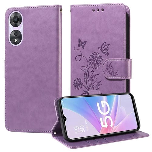 Funda de Cuero con Diseño de Mariposas y Flores En Relieve para Oppo A78 5G Global / A58X 5G / A1 Active (Morado)