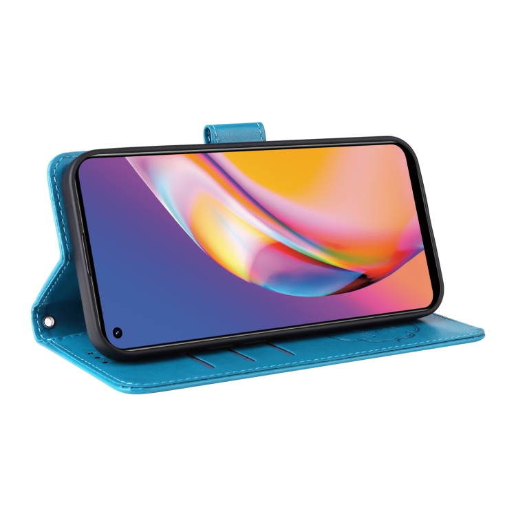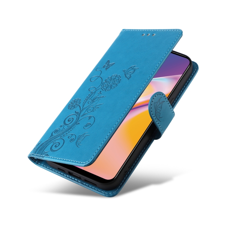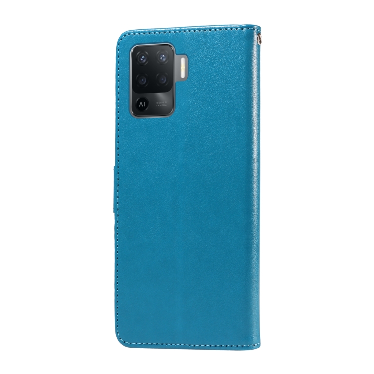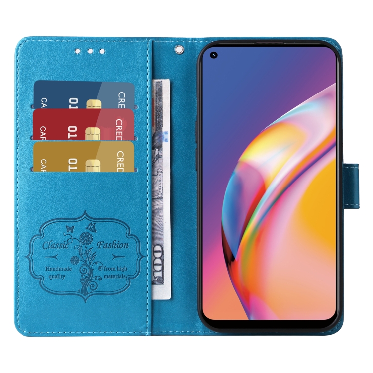 Funda de Cuero con Diseño de Mariposas y Flores En Relieve para Oppo A94 4G/5G/A95 5G/F19 Pro (Azul)