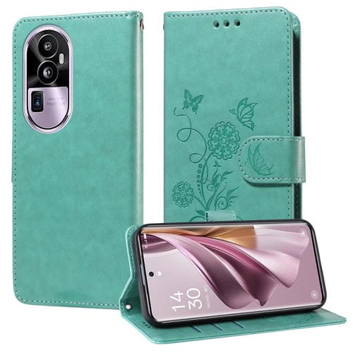 Funda de Cuero con Diseño de Mariposas y Flores En Relieve para Oppo Reno10 Pro+ (Verde)