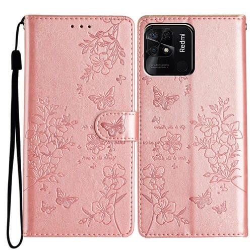 Funda de Cuero con Diseño de Mariposas y Flores para Redmi 10C (Oro Rosa)