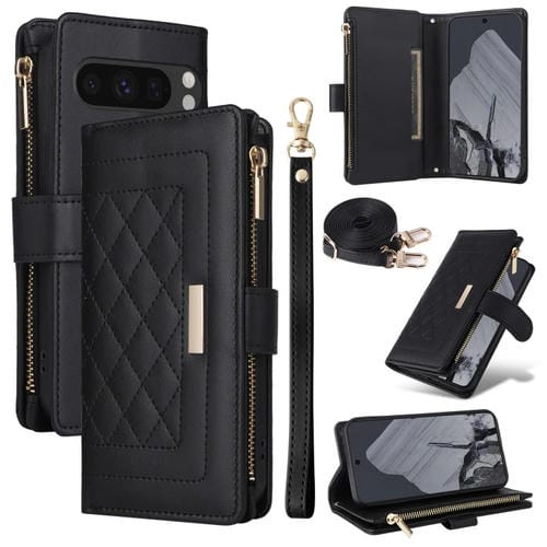 Funda de Cuero para Google Pixel 8 Pro con Diseño de Rombos y Billetera Cruzada con Cremallera (Negra)
