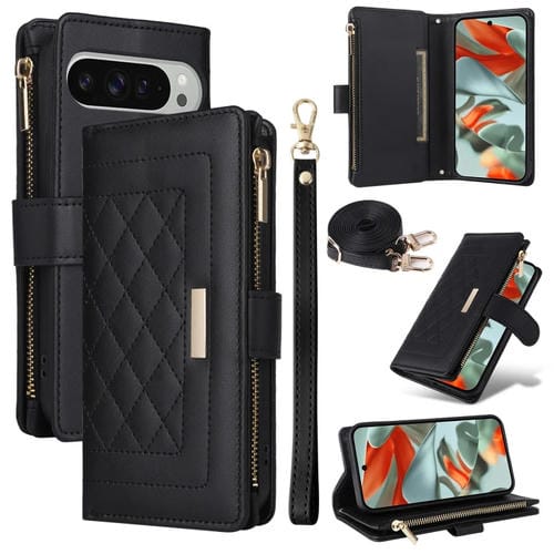 Funda de Cuero con Diseño de Rombos y Billetera Cruzada con Cremallera para Google Pixel 9 Pro XL (Negra)