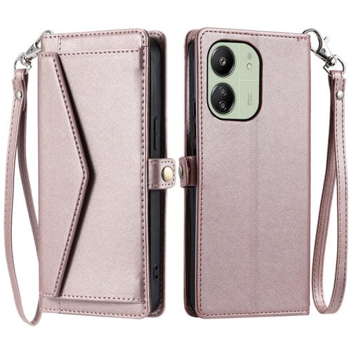 Funda de Cuero con Ranura para Múltiples Tarjetas y Cordón para Redmi 13C 4G/5G (Oro Rosa)