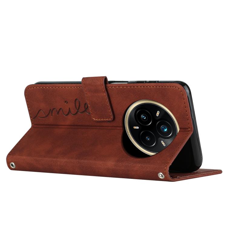 Funda de Cuero con Relieve de Corazón para Realme 14 Pro con Cordón Largo (Marrón)